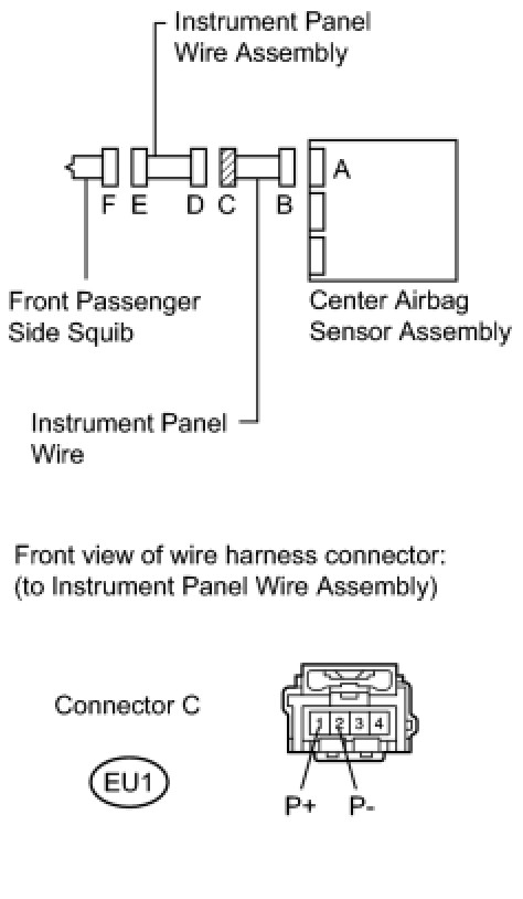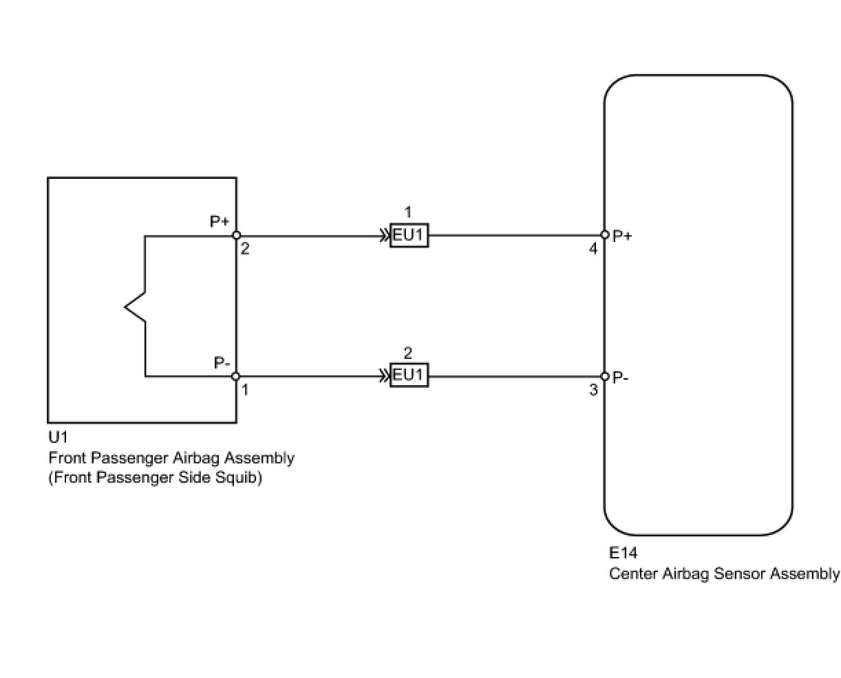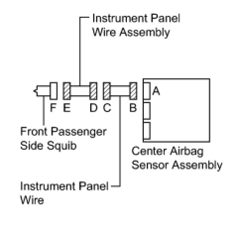 The front passenger side squib circuit consists of the center airbag sensor assembly and the front passenger airbag assembly.