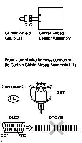 Never connect the tester to the curtain shield airbag assembly LH (curtain shield squib LH) for measurement, as this may lead to a serious injury due to airbag deployment.
