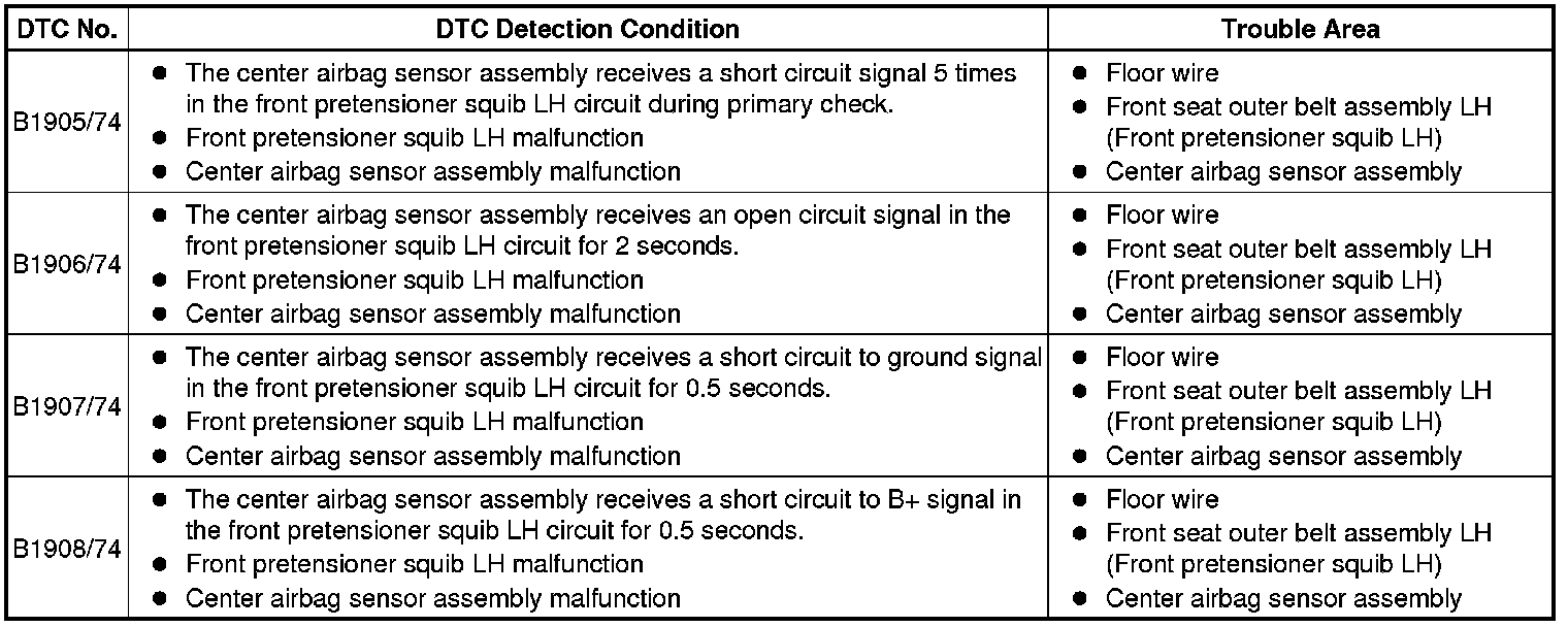SUPPLEMENTAL RESTRAINT SYSTEMS: AIRBAG SYSTEM: B1905/74-B1908/74; Short in Front Pretensioner Squib LH Circuit; 2013 MY Corolla [07/2012 -]