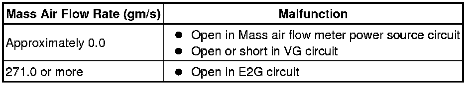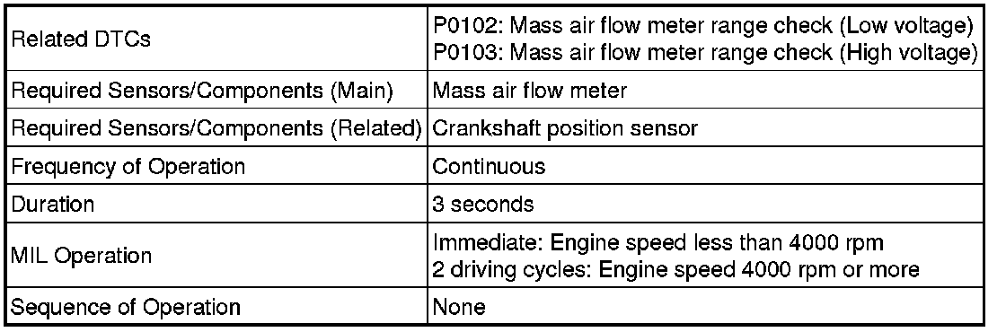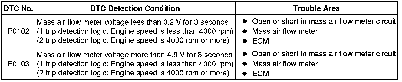 If there is a defect in the mass air flow meter or an open or short circuit, the voltage level deviates from the normal operating range. The ECM interprets this deviation as a malfunction in the mass air flow meter circuit and sets a DTC.