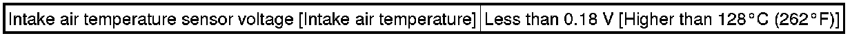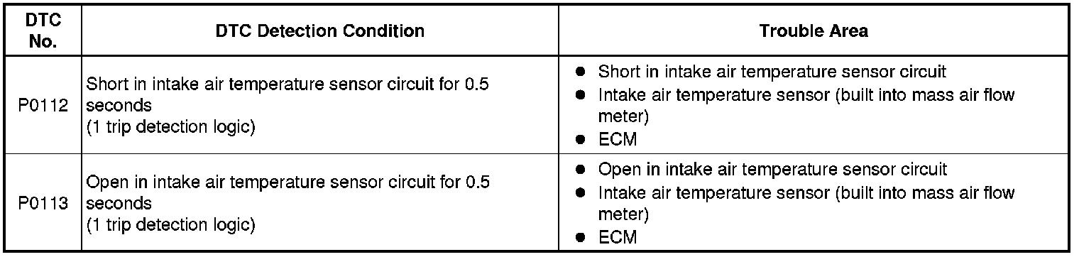 If the sensor output voltage is more than 4.91 V for 0.5 seconds or more, the ECM determines that there is an open in the intake air temperature sensor circuit, and sets DTC P0113. Conversely, if the output voltage is less than 0.18 V for 0.5 seconds or more, the ECM determines that there is a short in the sensor circuit, and sets DTC P0112.