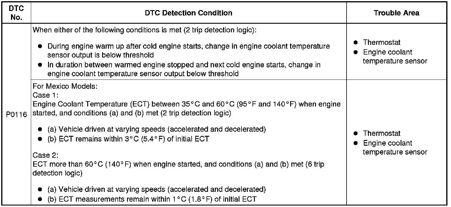 * If any of DTCs P0115, P0117, P0118 or P0125 are set simultaneously with DTC P0116, the engine coolant temperature sensor may have an open or a short circuit. Troubleshoot those DTCs first.