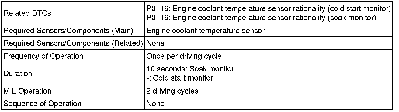 The monitor runs when the engine is started cold. If the change in engine coolant temperature sensor output until the engine is warmed up completely is less than the threshold, it is determined that a malfunction has occurred in the engine coolant temperature sensor. When this is detected in 2 consecutive driving cycles, the MIL is illuminated and the DTC is stored.