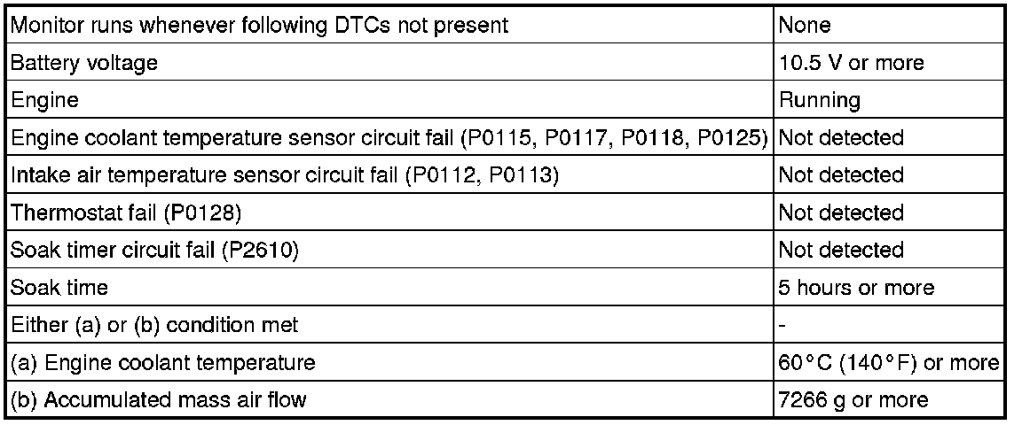 If after driving for 250 seconds, the engine coolant temperature remains within 3°C (5.4°F) of the starting temperature, the DTC is stored (2 trip detection logic).