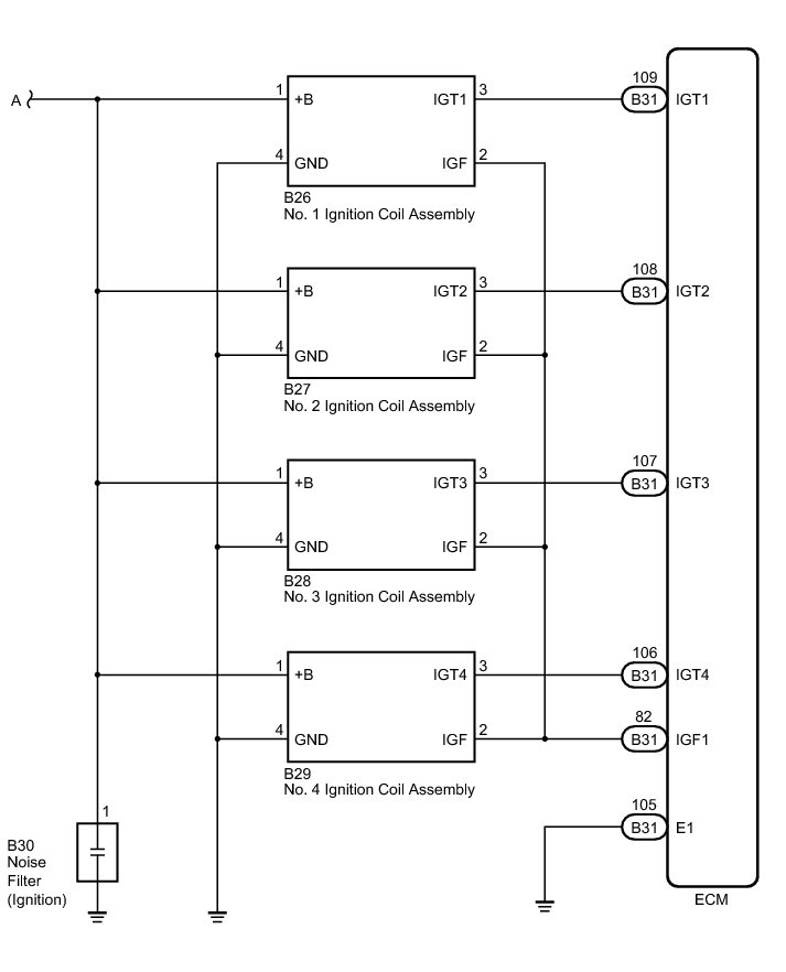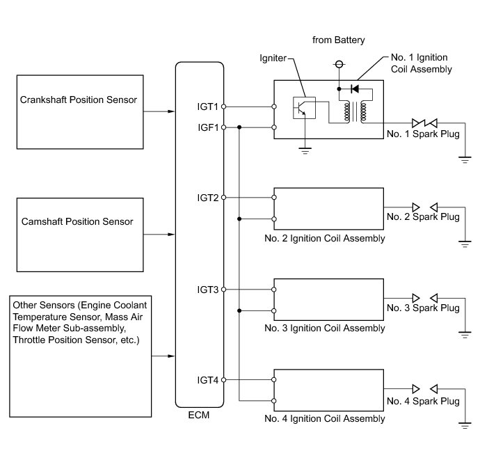 The ECM determines the ignition timing and transmits the ignition (IGT) signals to each cylinder. Using the IGT signal, the ECM turns the power transistor inside the igniter on and off. The power transistor, in turn, switches on and off the current to the primary coil. When the current to the primary coil is cut off, a powerful voltage is generated in the secondary coil. This voltage is applied to the spark plugs, causing them to spark inside the cylinders. As the ECM cuts the current to the primary coil, the igniter sends back an ignition confirmation (IGF) signal to the ECM, for each cylinder ignition.