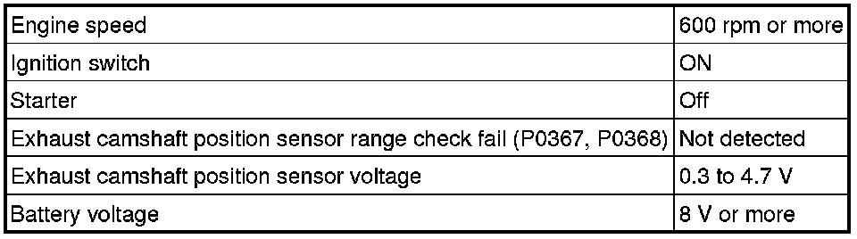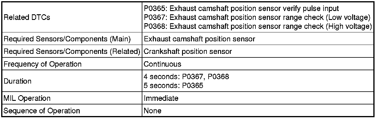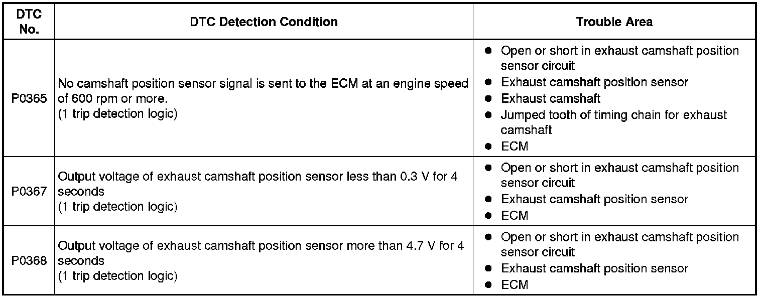DTC P0365, P0367 and P0368 indicate a malfunction relating to the exhaust camshaft position sensor circuit (the wire harness between the ECM and exhaust camshaft position sensor, and the exhaust camshaft position sensor itself).