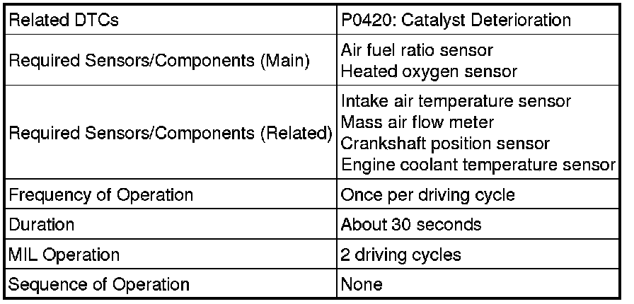 The ECM uses the oxygen storage capacity value to determine the state of the three-way catalytic converter. If any deterioration has occurred, the ECM illuminates the MIL and stored the DTC.