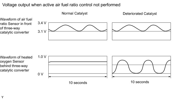 * If the three-way catalytic converter has deteriorated, the heated oxygen sensor (located behind the three-way catalytic converter) voltage output fluctuates up and down frequently, even under normal driving conditions (active air fuel ratio control is not performed).