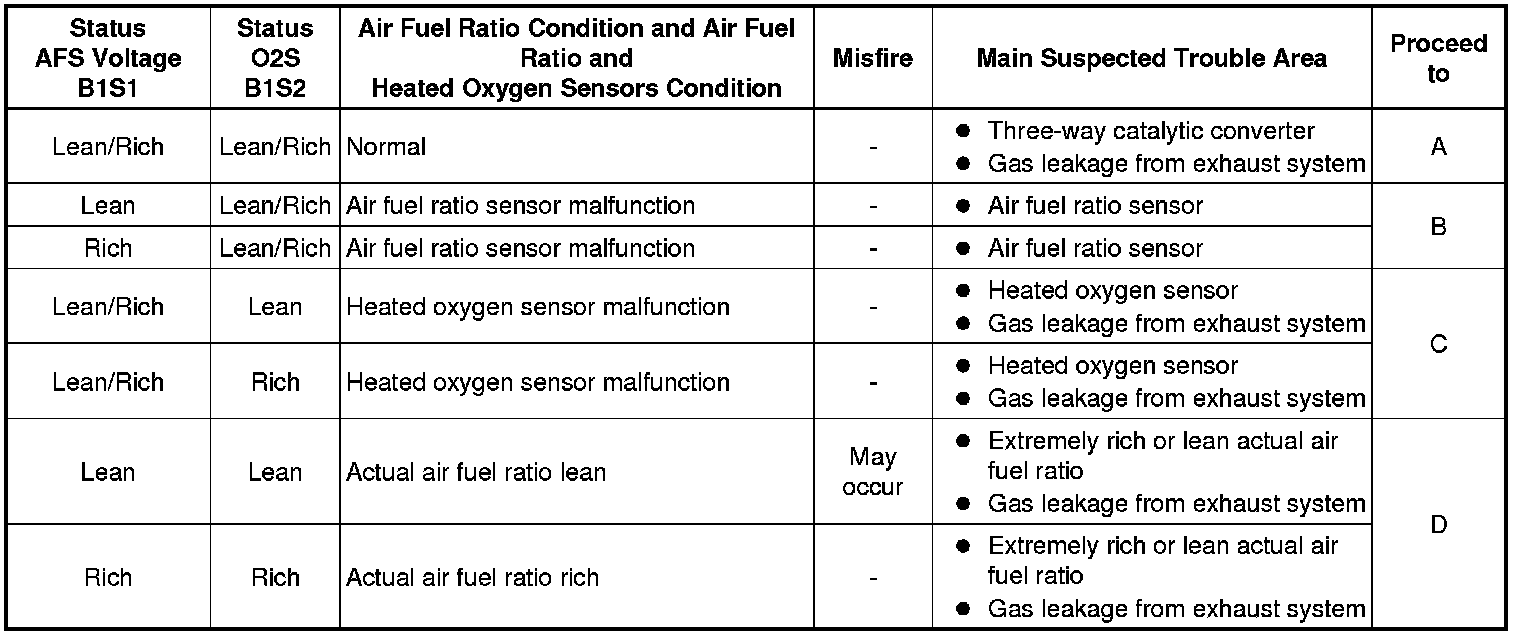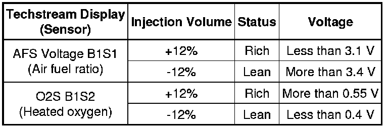 Lean: During Control the Injection Volume, the air fuel ratio sensor output voltage (AFS Voltage) is consistently more than 3.4 V, and the heated oxygen sensor output voltage (O2S) is consistently less than 0.4 V.