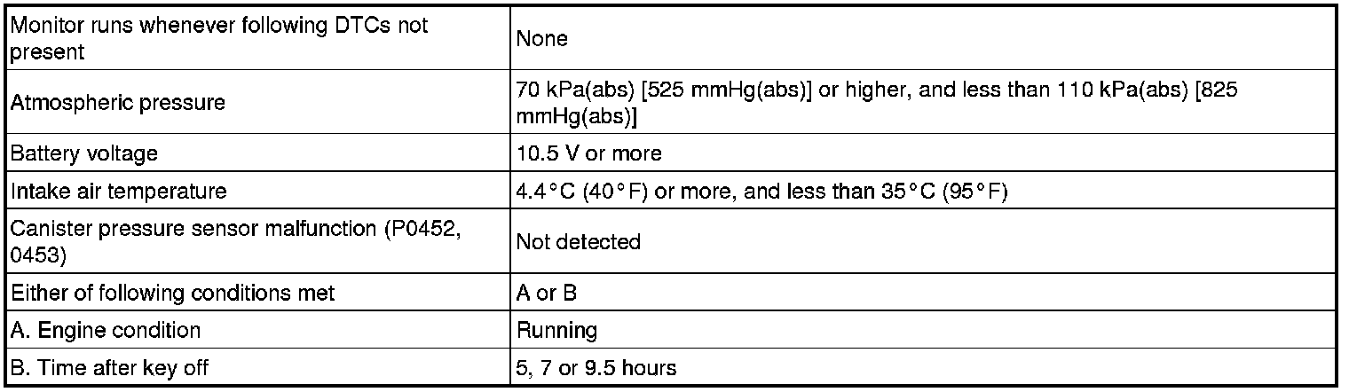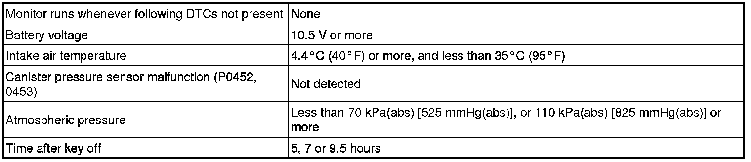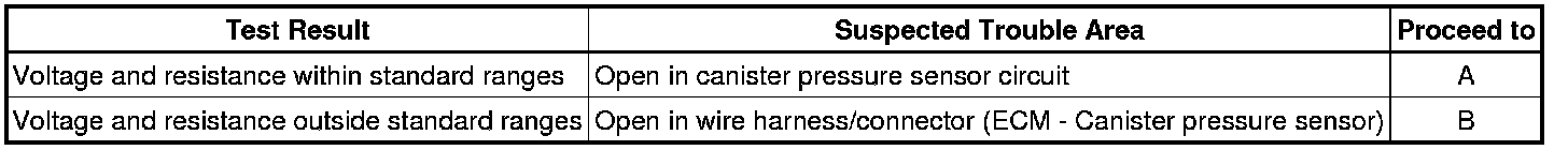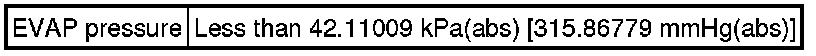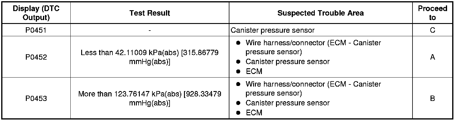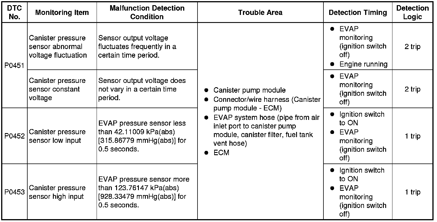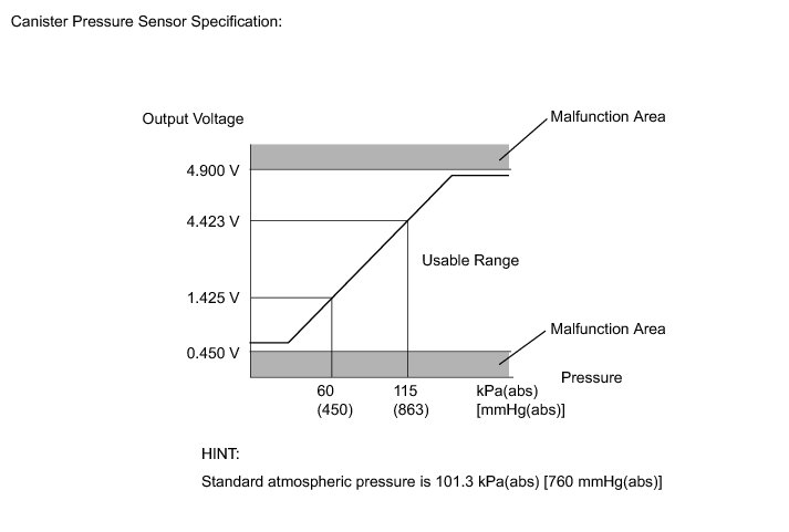 If the canister pressure sensor voltage output (pressure) is less than 0.45 V: 42.11009 kPa(abs) [315.86779 mmHg(abs)], the ECM interprets this as an open or short circuit in the canister pressure sensor or its circuit, and stops the EVAP system monitor. The ECM then illuminates the MIL and stores the DTC (1 trip detection logic).