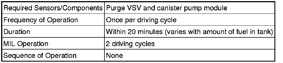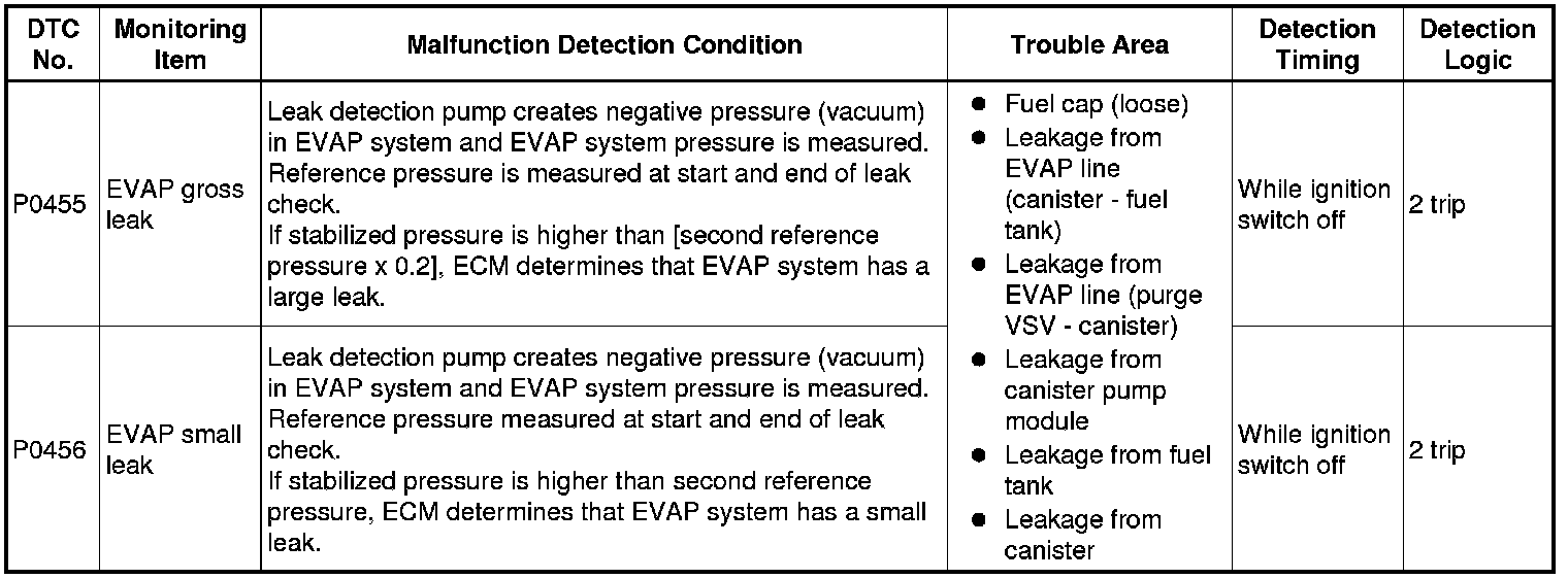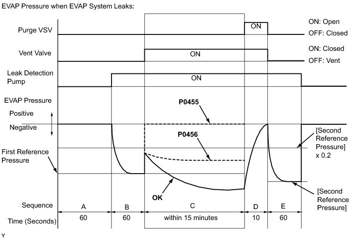 In operation C, the leak detection creates negative pressure (vacuum) in the EVAP system and the EVAP system pressure is measured. If the stabilized system pressure is higher than the second reference pressure, the ECM determines that the EVAP system has a small leak, illuminates the MIL and sets the DTC (2 trip detection logic).