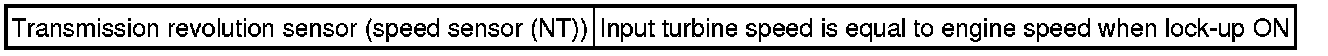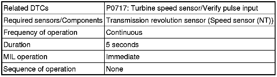 When the output shaft speed is higher than the expected value and the input shaft speed is 300 rpm or less while running with the shift in the D position, the ECM will conclude that there is malfunction of the input turbine speed sensor (NT). The ECM will illuminate the MIL.
