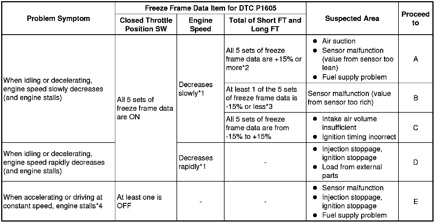 * In contrast to normal malfunction diagnosis for components, circuits and systems, DTCs P1603 and P1605 are used to determine the malfunctioning area from the problem symptoms and freeze frame data when the user mentions problems such as engine stall.