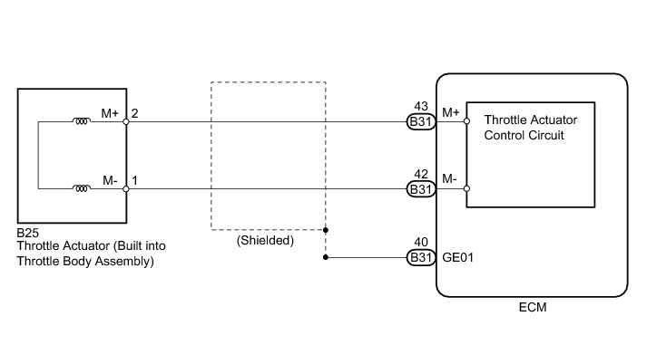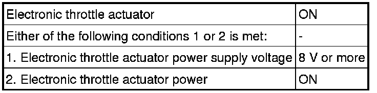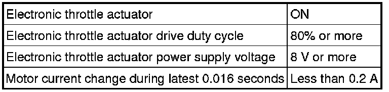 * When the electrical current is less than 0.5 A and the throttle actuator duty ratio exceeds 80%, the ECM interprets this as the current being outside the standard range, illuminates the MIL and sets a DTC.