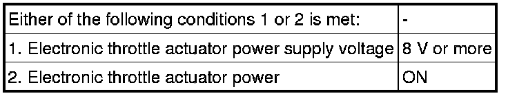 The ECM monitors the electrical current through the electronic actuator, and detects malfunctions and open circuits in the throttle actuator based on the current value. If the current is outside the standard range, the ECM determines that there is a malfunction in the throttle actuator. In addition, if the throttle valve does not function properly (for example, stuck on), the ECM determines that there is a malfunction. The ECM then illuminates the MIL and sets a DTC.