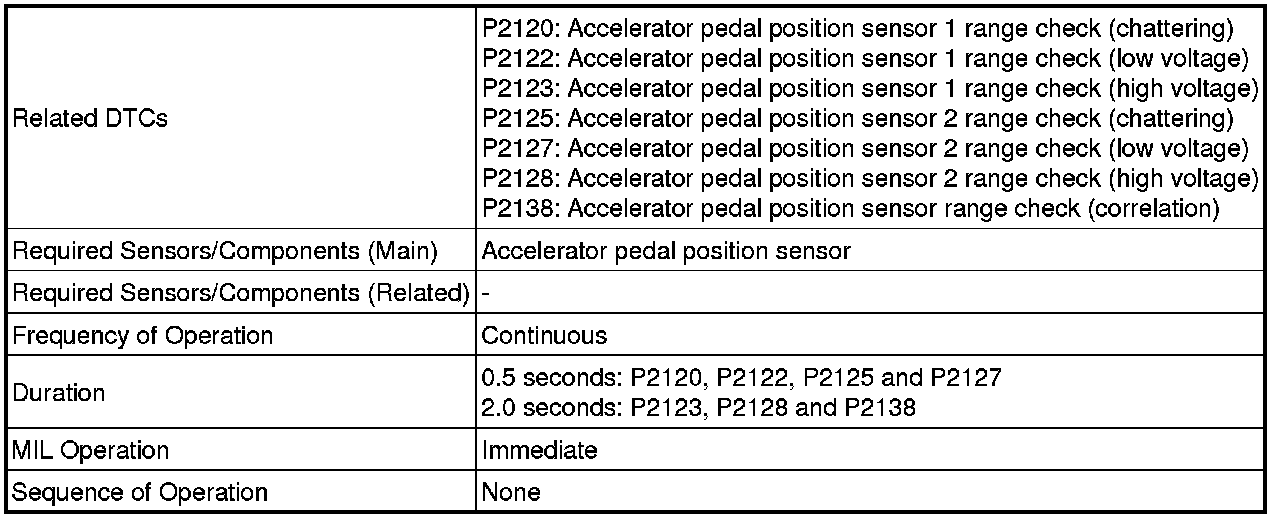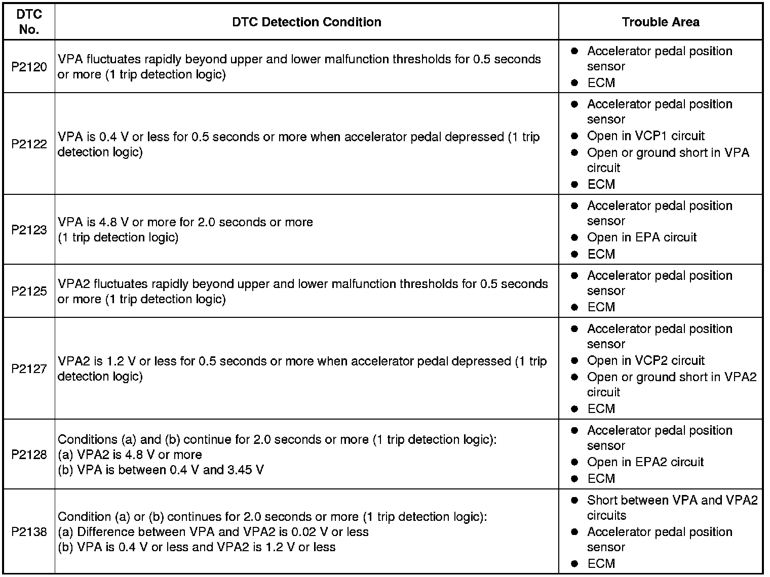 When the output voltage of VPA drops 0.4 V or less for 0.5 seconds or more when the accelerator pedal is fully depressed, DTC P2122 is set.