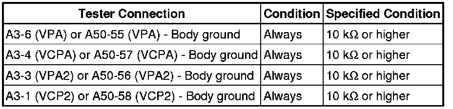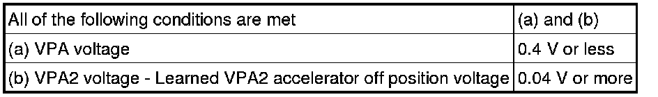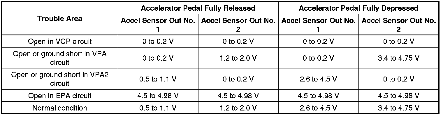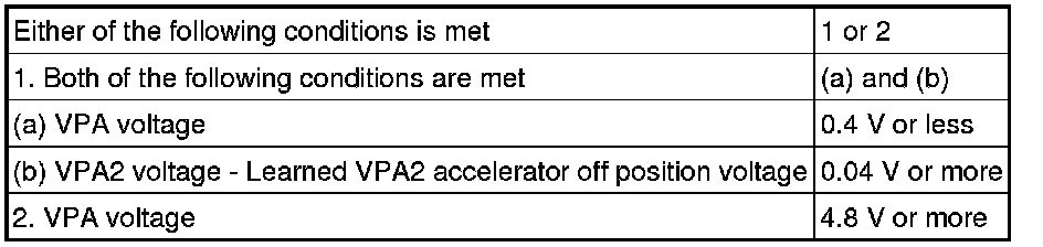 When either the output voltage of VPA or VPA2 deviates from the standard range, or the difference between the output voltages of the 2 sensor circuits is less than the threshold, the ECM determines that there is a malfunction in the accelerator pedal position sensor. The ECM then illuminates the MIL and sets a DTC.