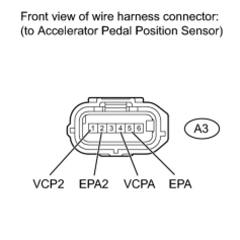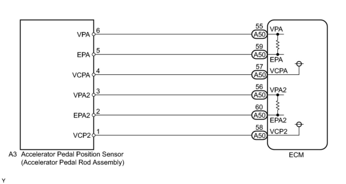 The accelerator pedal position sensor is mounted on the accelerator pedal bracket and has 2 sensor circuits: VPA (main) and VPA2 (sub). This sensor is a non-contact type and uses Hall-effect elements in order to yield accurate signals even in extreme conditions. The voltage from this sensor, which is applied to terminals VPA and VPA2 of the ECM, varies between 0.5 V and 4.75 V in proportion to the operating angle of the accelerator pedal (throttle valve). A signal from VPA indicates the actual accelerator pedal opening angle (throttle valve opening angle) and is used for engine control. A signal from VPA2 conveys the status of the VPA circuit and is used to check the accelerator pedal position sensor itself.