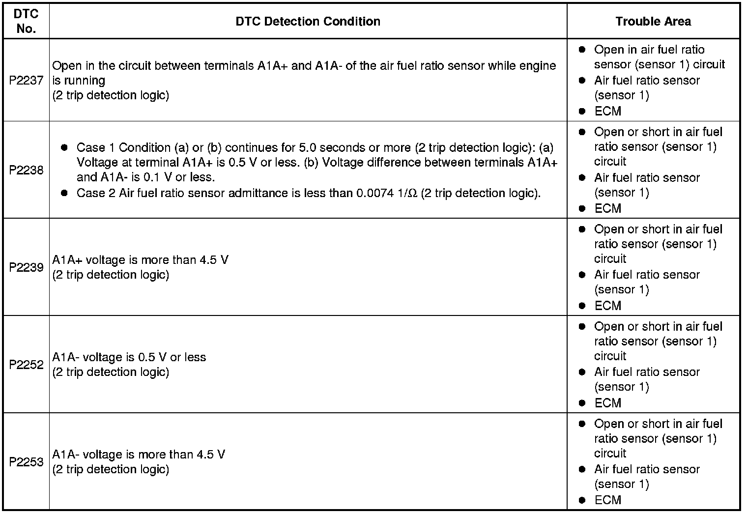 P2237: (Air Fuel Ratio Sensor Open Circuit Between A1A+ and A1A-)