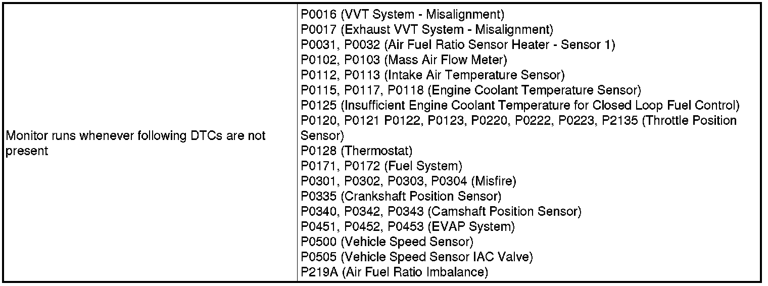 These DTCs are output when there is an open or short in the air fuel ratio sensor circuit, or if air fuel ratio sensor output drops. To detect these problems, the voltage of the air fuel ratio sensor is monitored when turning the ignition switch to the ON, and the admittance (admittance is an electrical term that indicates the ease of flow of current) is checked while driving. If the voltage of the air fuel ratio sensor is more than 0.5 V, and 4.5 V or less, it is considered normal. If the voltage is out of the specified range, or the admittance is less than the standard value, the ECM will determine that there is a malfunction in the air fuel ratio sensor. If the same malfunction is detected in next driving cycle, the MIL will be illuminated and a DTC will be stored.