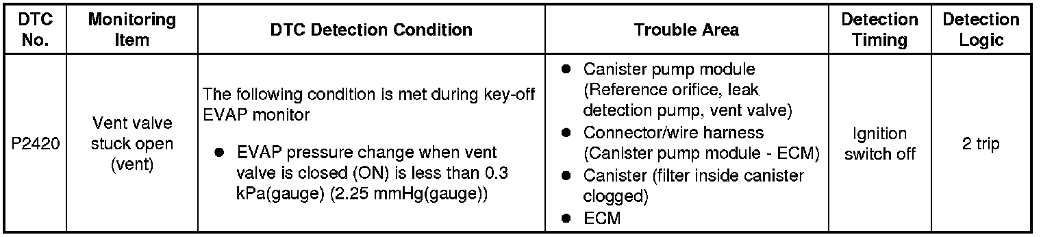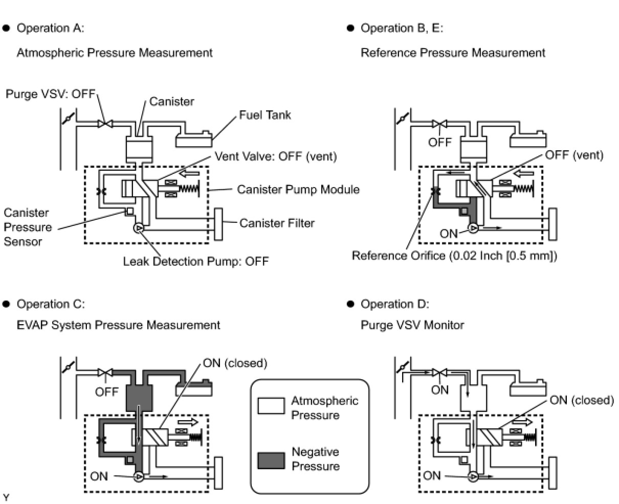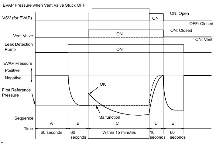 In operation C, the vent valve turns on (closed) and the EVAP system pressure is then measured by the ECM using the canister pressure sensor to conduct an EVAP leak check. If the pressure does not increase when the vent valve is open, the ECM interprets this as the vent valve being stuck open. The ECM illuminates the MIL and stores the DTC.