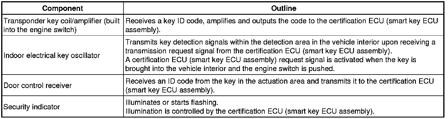 (1) When the driver (or passenger) is sitting in the vehicle while carrying the key, and the engine switch is pressed while the brake pedal is depressed, the main body ECU (instrument panel junction block) recognizes that the engine start operation has occurred and sends a certification request signal to the certification ECU (smart key ECU assembly). Upon receipt of the certification request signal, the certification ECU (smart key ECU assembly) sends a request signal to the indoor electrical key oscillator. Upon receipt of the request signal, the indoor electrical key oscillator sends a request signal to detect if the key is inside the vehicle. When the key receives this request signal, it answers by sending an ID code containing a response code through the glass antenna to the door control receiver. Upon receipt of the ID code, the certification ECU (smart key ECU assembly) analyzes the code. If the interior certification passes, then the main body ECU (instrument panel junction block) sends a certification pass response signal. When the main body ECU (instrument panel junction block) receives this signal, the ACC relay is switched on and the IG1 and IG2 relays are switched on in sequence. At this time, the engine switch indicator illuminates in green. Then the certification ECU (smart key ECU assembly) checks that the power source mode has been changed and sends a steering lock command signal to the main body ECU (instrument panel junction block). After receiving this signal, the main body ECU (instrument panel junction block) supplies power to the steering lock actuator. Then the steering lock ECU confirms that the certification ECU (smart key ECU assembly) is certified (via the ID code box (immobiliser code ECU)) and drives the steering actuator motor until the steering is unlocked. After unlocking the steering, an unlock completed signal is sent to the certification ECU (smart key ECU assembly). Upon receipt of this signal, the certification ECU (smart key ECU assembly) sends an unset command signal to the ID code box (immobiliser code ECU). Once this signal is received, the ID code box (immobiliser code ECU) confirms that the certification ECU (smart key ECU assembly) is certified, sends an immobiliser unset command signal to the ECM, and sends a security indicator light off signal to the certification ECU (smart key ECU assembly).
