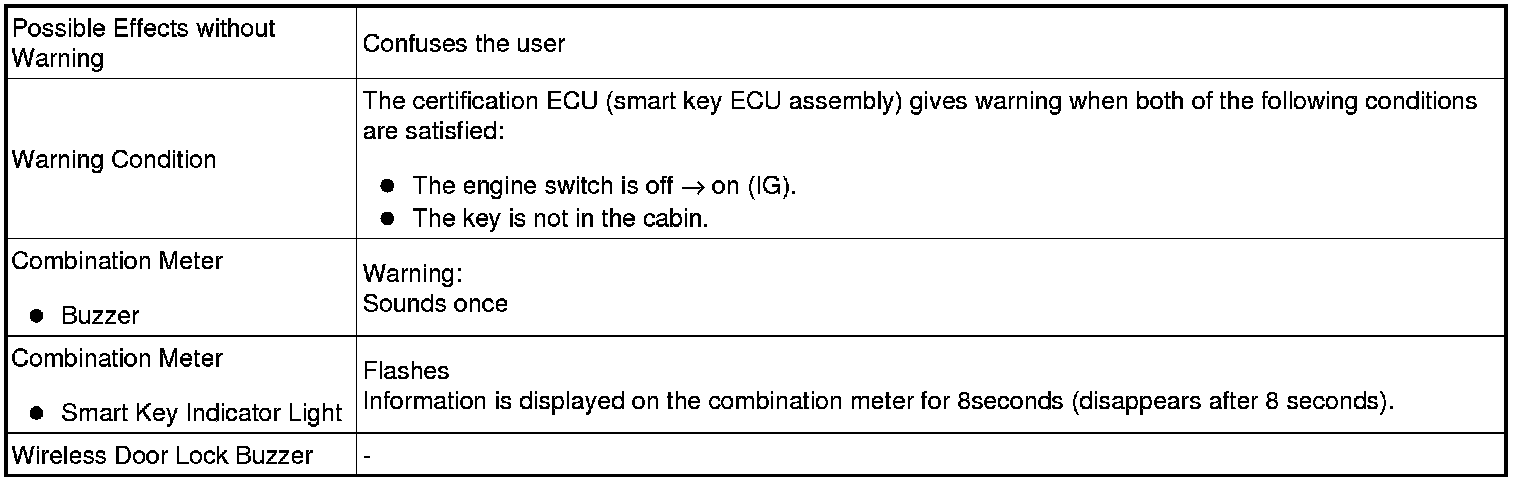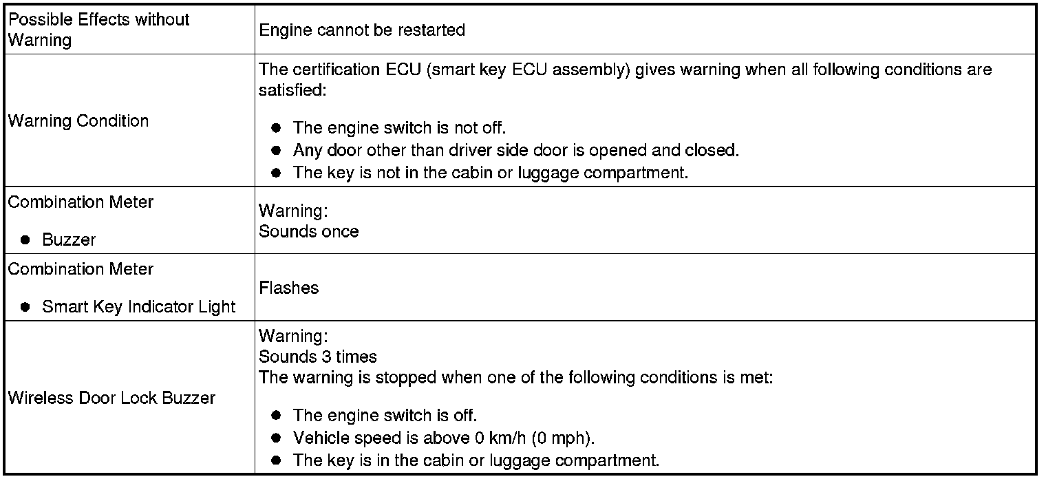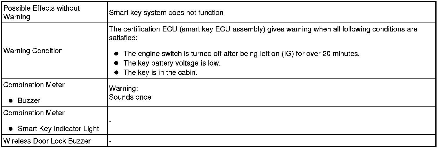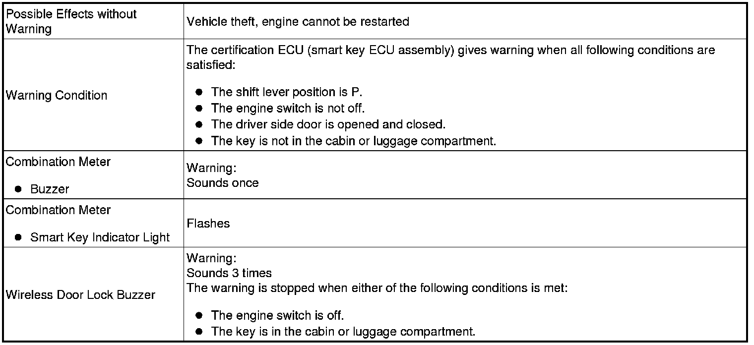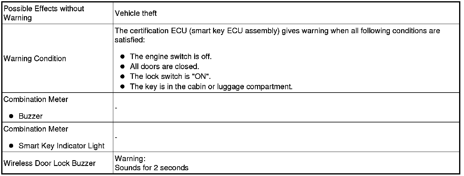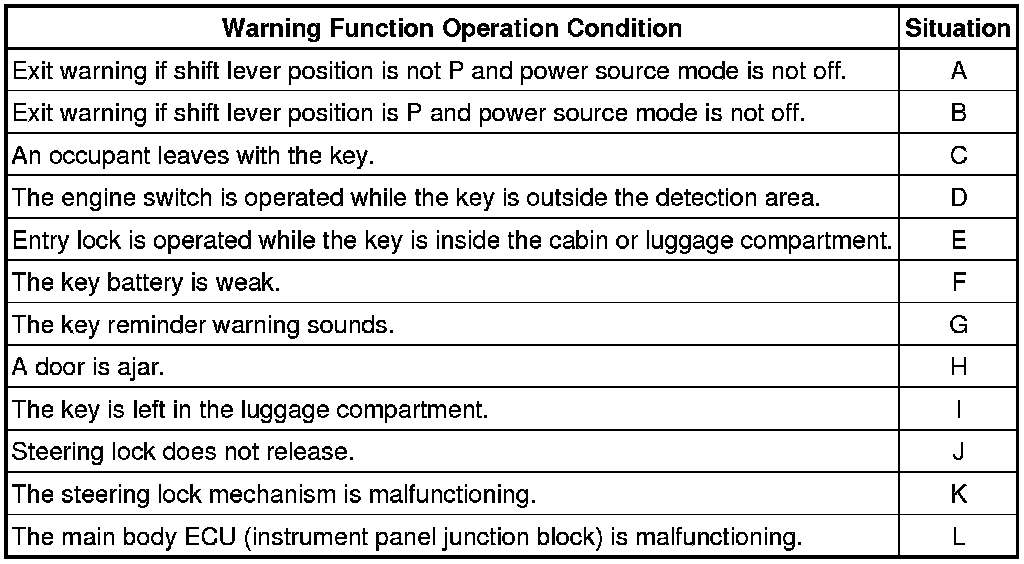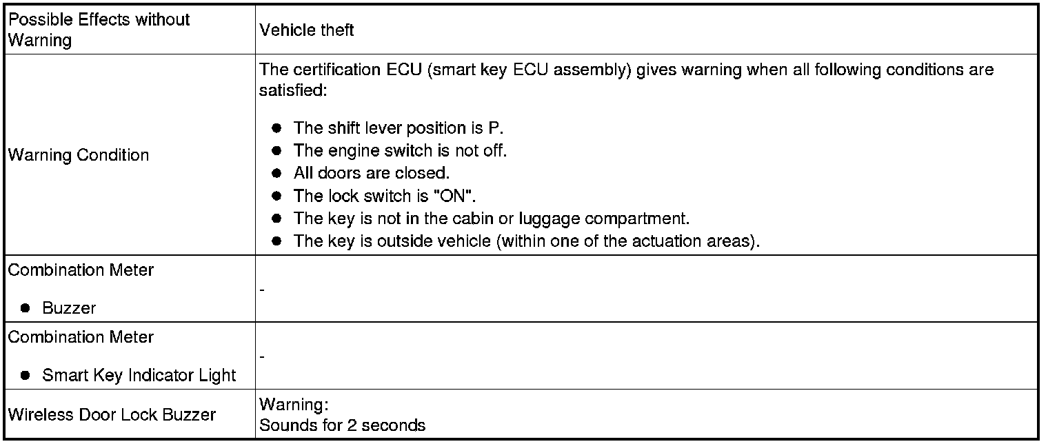 When any of the situations below occur, the smart key system causes the certification ECU (smart key ECU assembly) to sound the buzzer in the combination meter and the wireless door lock buzzer in order to alert the driver.