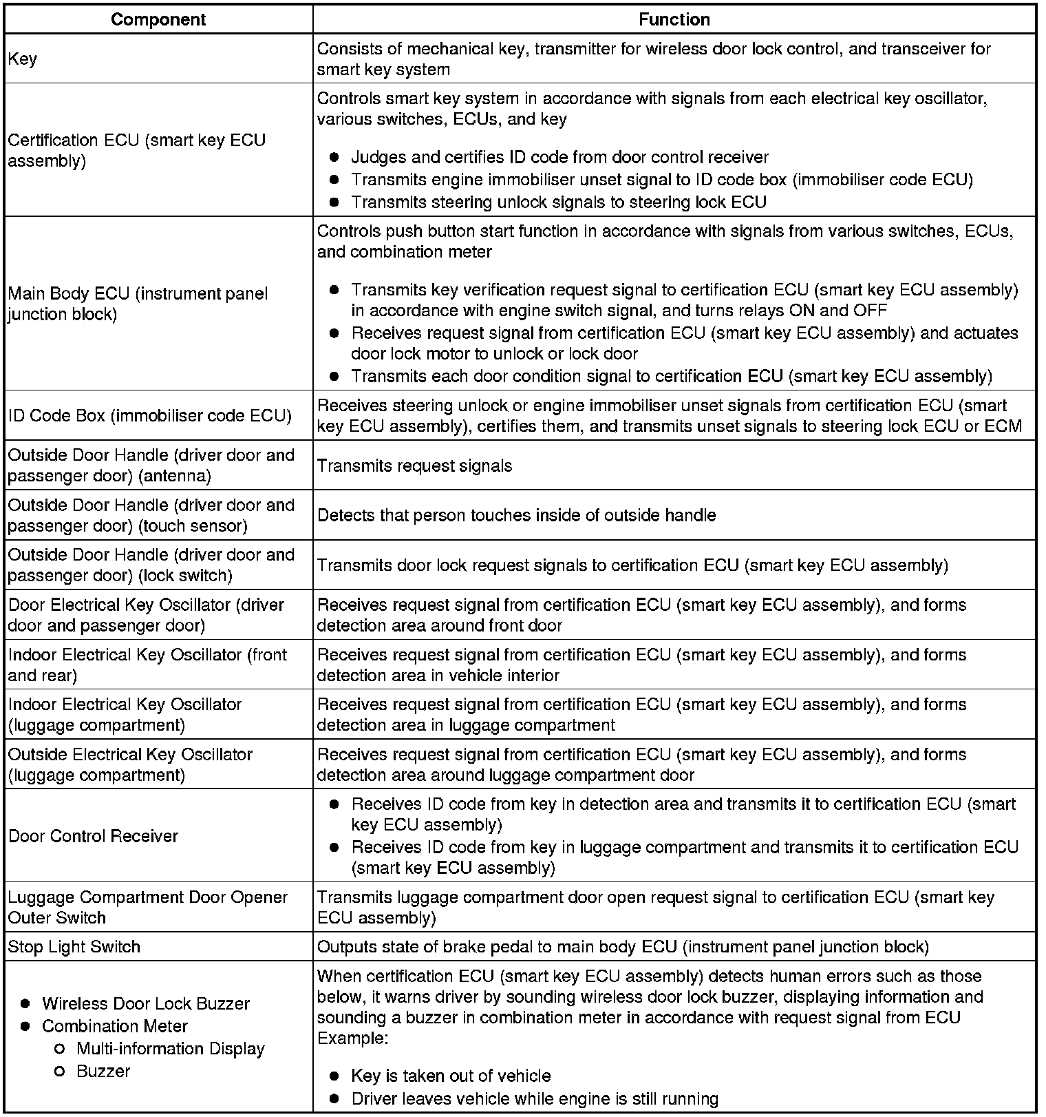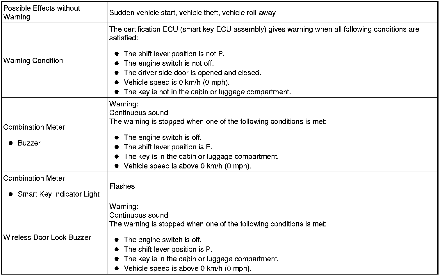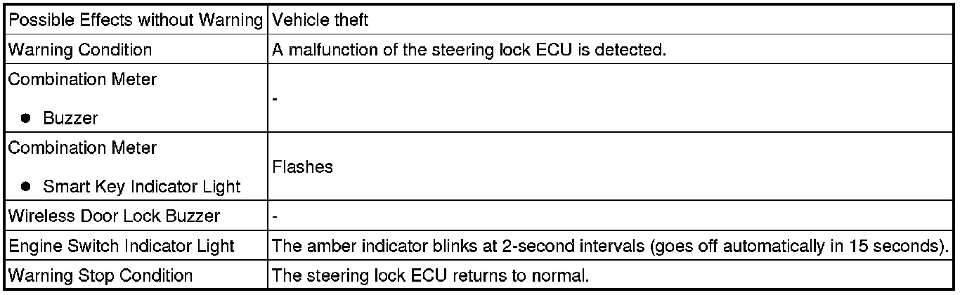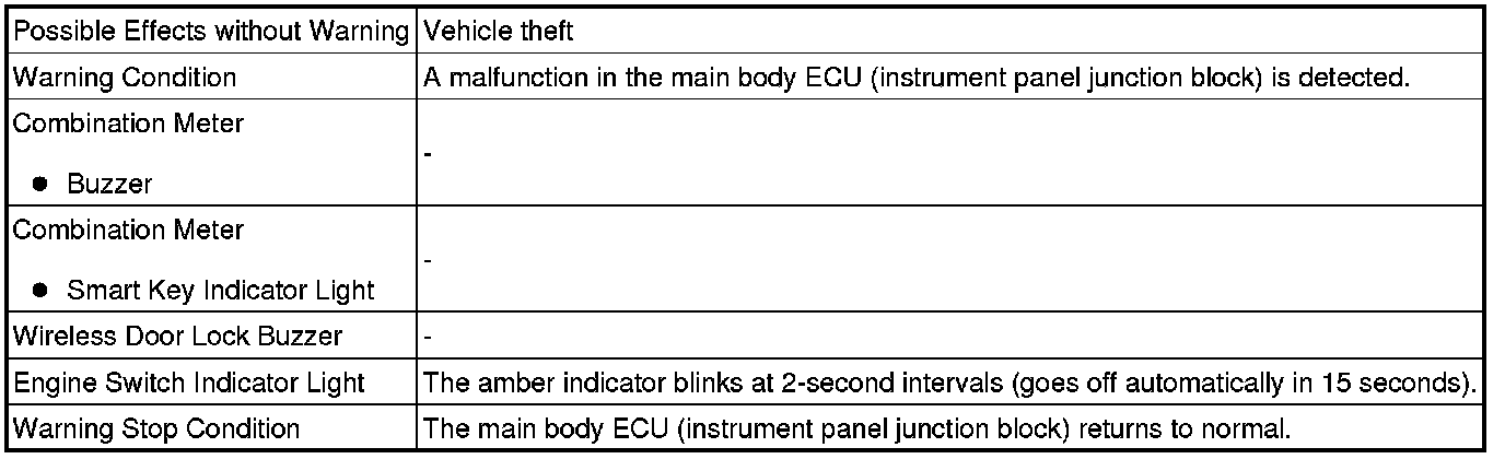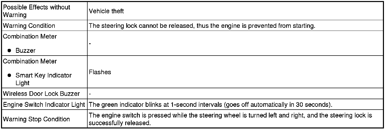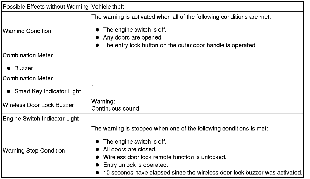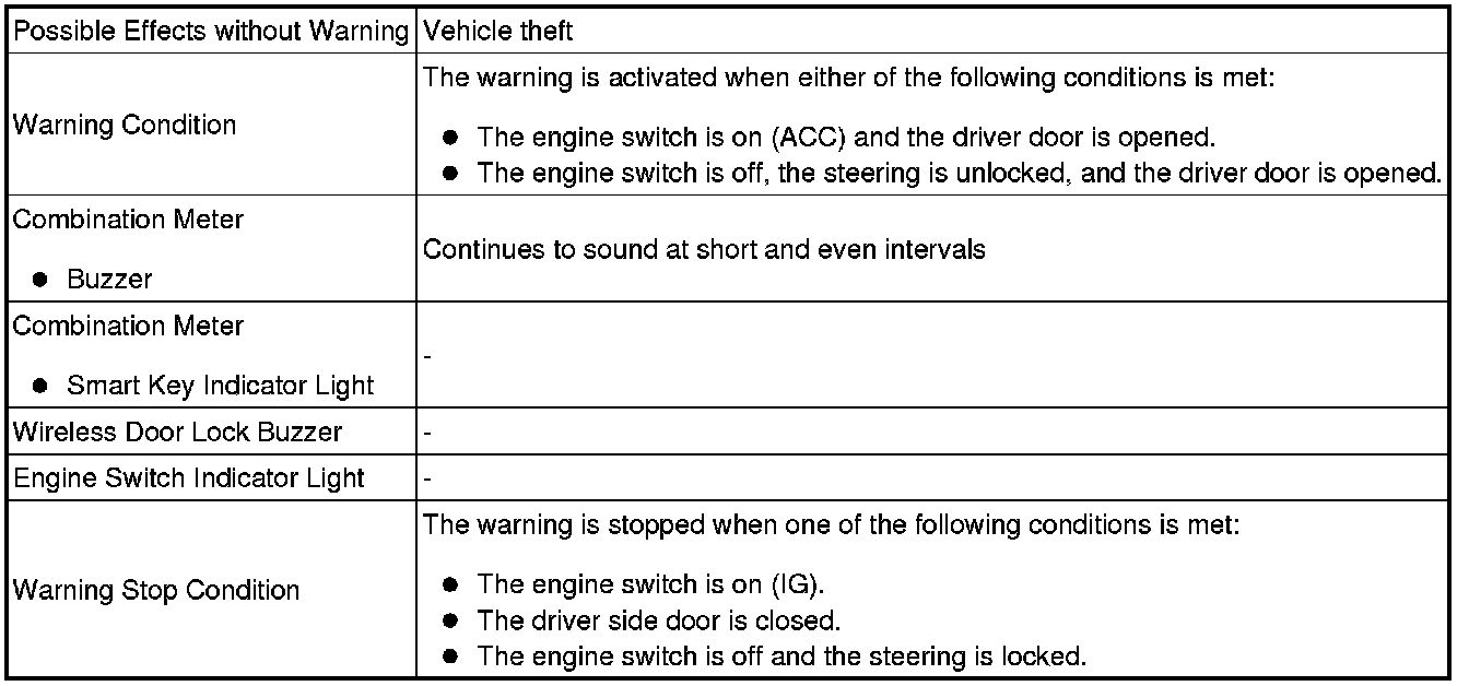 When any of the situations below occur, the smart key system causes the certification ECU (smart key ECU assembly) to sound the buzzer in the combination meter and the wireless door lock buzzer in order to alert the driver.
