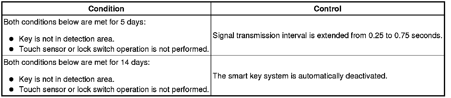 In the smart key system, signals are emitted outside the vehicle at a prescribed interval (0.25 seconds) when the doors are locked. Therefore, the vehicle battery could be drained if the vehicle remains parked for a long time. For this reason, the controls listed below are carried out: