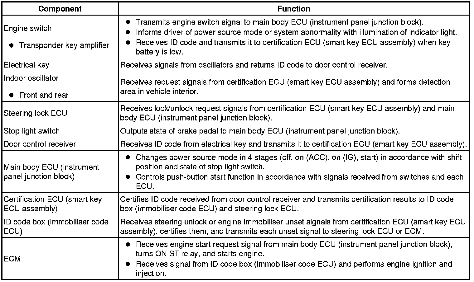 (a) The push-button start function uses a push-type engine switch, which the driver can operate by merely carrying the electrical key. This system consists primarily of the main body ECU (instrument panel junction block), engine switch, ID code box (immobiliser code ECU), steering lock ECU, electrical key, ACC relay, IG1 relay, IG2 relay and certification ECU (smart key ECU assembly). The main body ECU (instrument panel junction block) controls the function. This function operates in cooperation with the smart key system.