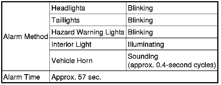 * The alarm function will be activated when someone attempts to forcibly unlock the any of the doors, open any of the doors or the luggage compartment door while the system is in the armed state.