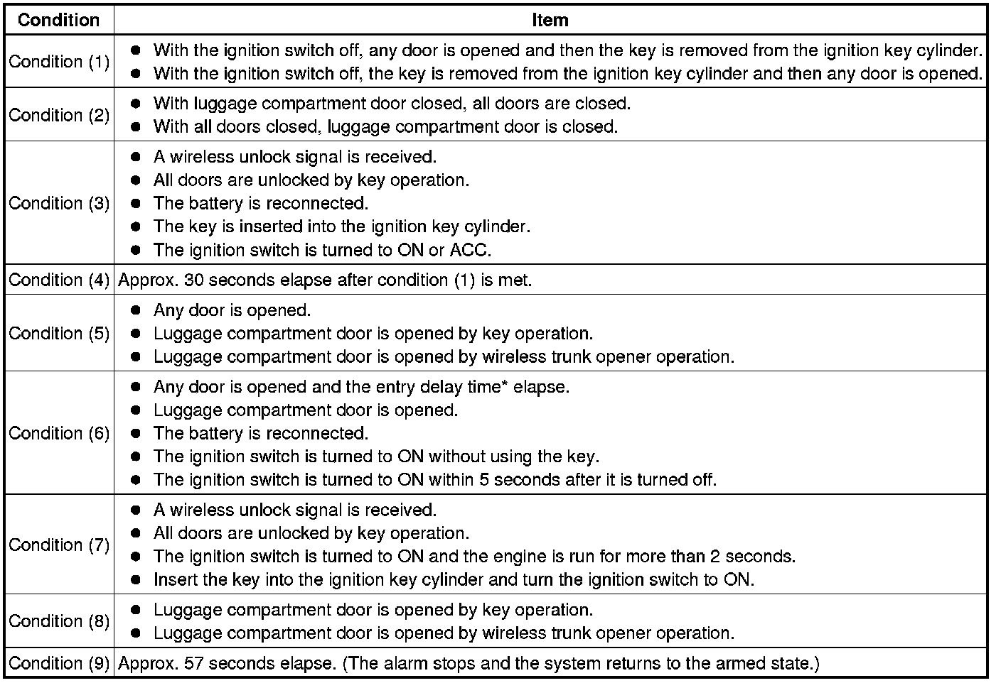 * *: When any door is opened while all the doors are closed during passive arming mode, the entry delay time starts. If the switch condition (armed state -> disarmed state (1) or (2)) is met during the entry delay time, the theft deterrent system will return to disarmed state (1) or (2). However, if the switch condition for disarmed state (1) or (2) is not met, the theft deterrent system will recognize it as a theft and set off the alarm. Entry delay time of 0, 14 or 30 sec. can be selected by the customizing function.