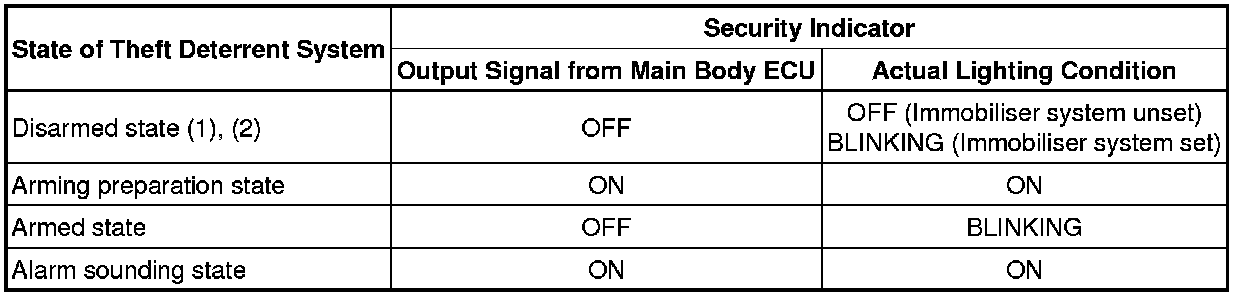 When the immobiliser system is set, the security indicator light assembly blinks during both the disarmed state and the armed state, due to output signals from the immobiliser system.