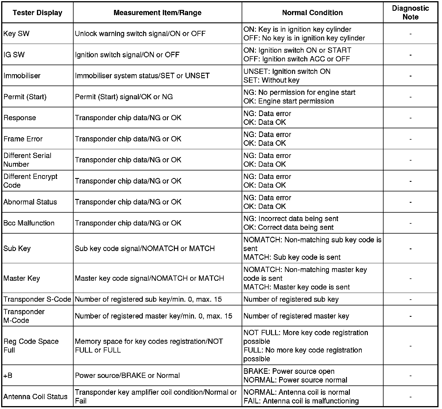 (d) Enter the following menus: Body Electrical / Immobiliser / Data List.