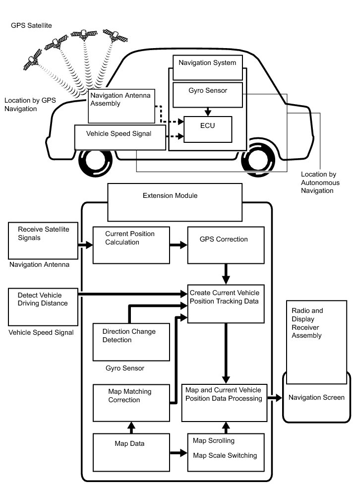 This method determines the relative vehicle position based on the driving track determined by the gyro located in the extension module and the vehicle speed signal.