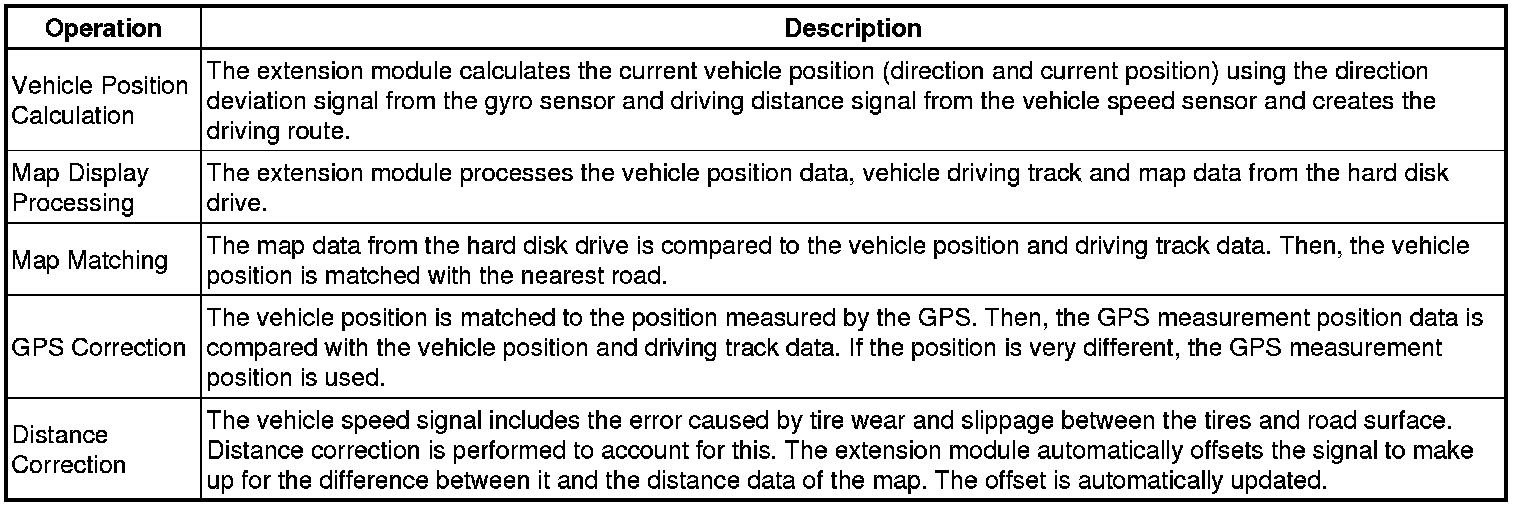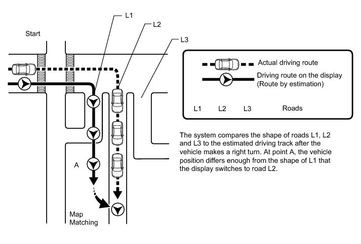 The current driving route is calculated by autonomous navigation (according to the gyro sensor and vehicle speed signal) and GPS navigation. This information is then compared with possible road shapes from the map data in the hard disk drive and the vehicle position is set onto the most appropriate road.