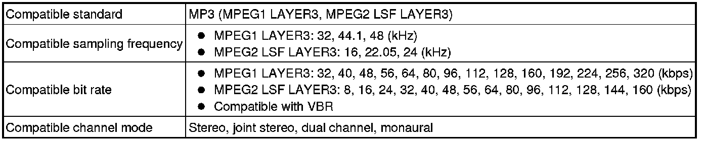 * As for MP3/WMA files written in any unlisted format, the contents of the files may not be played normally or the file names or folder names may not be displayed correctly.