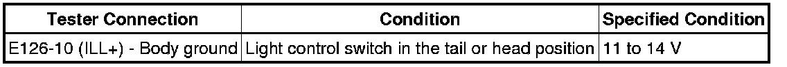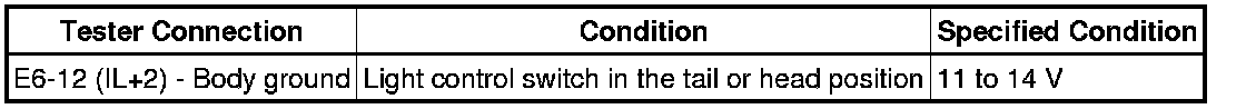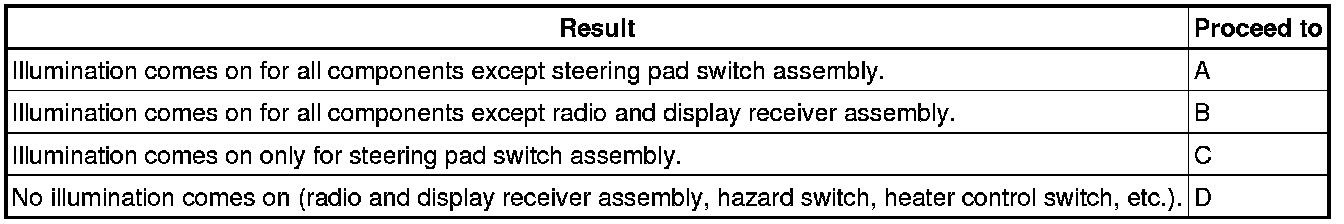 (a) Check if the illumination for the radio and display receiver assembly, steering pad switch assembly, heater control switch or others (hazard switch, transmission control switch, etc.) comes on when the light control switch is turned to the head or tail position.