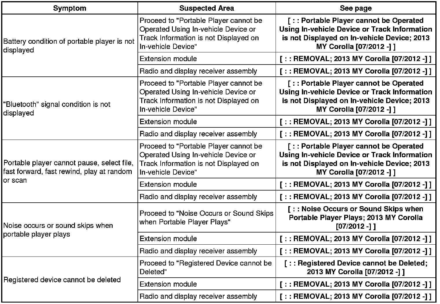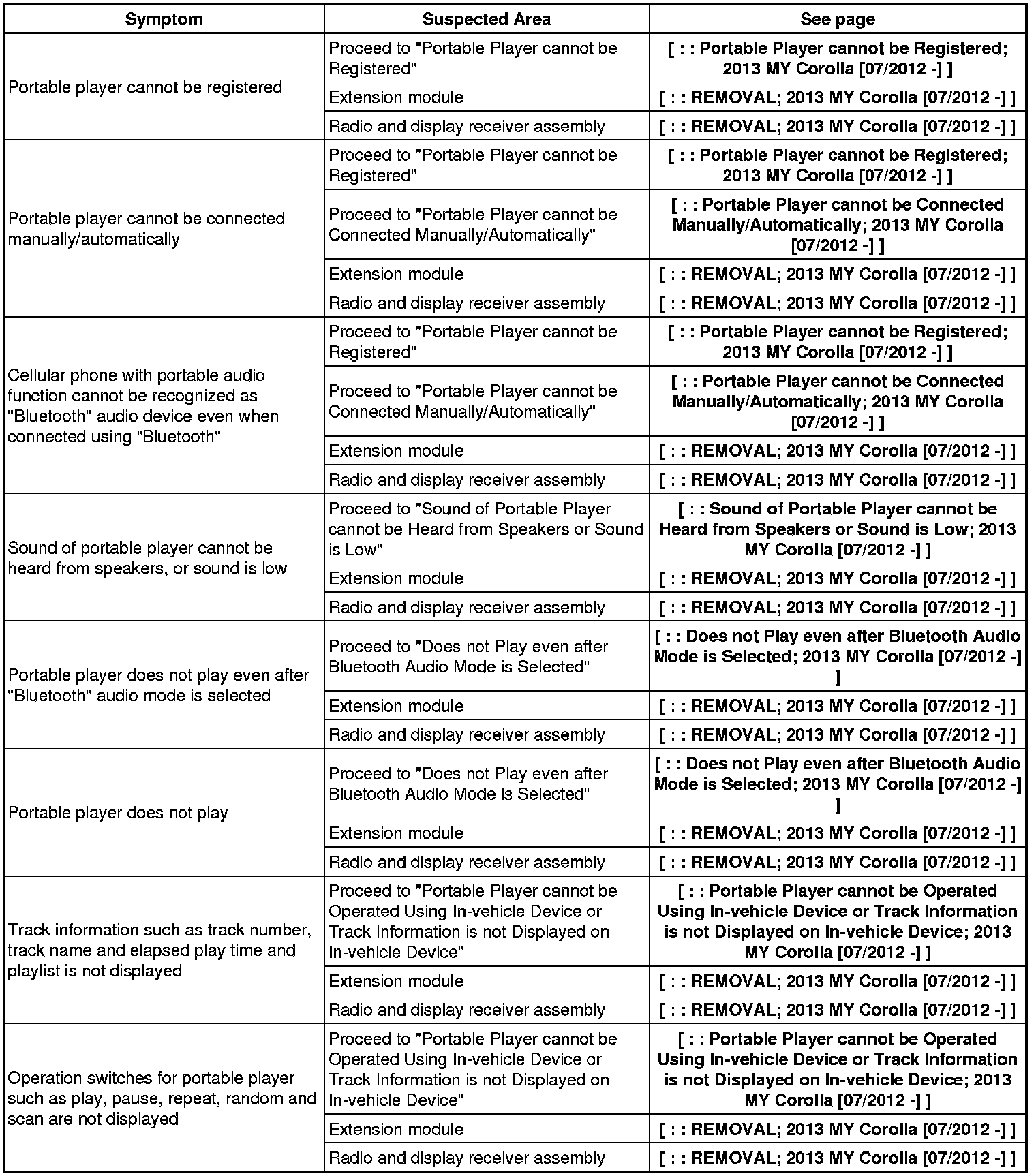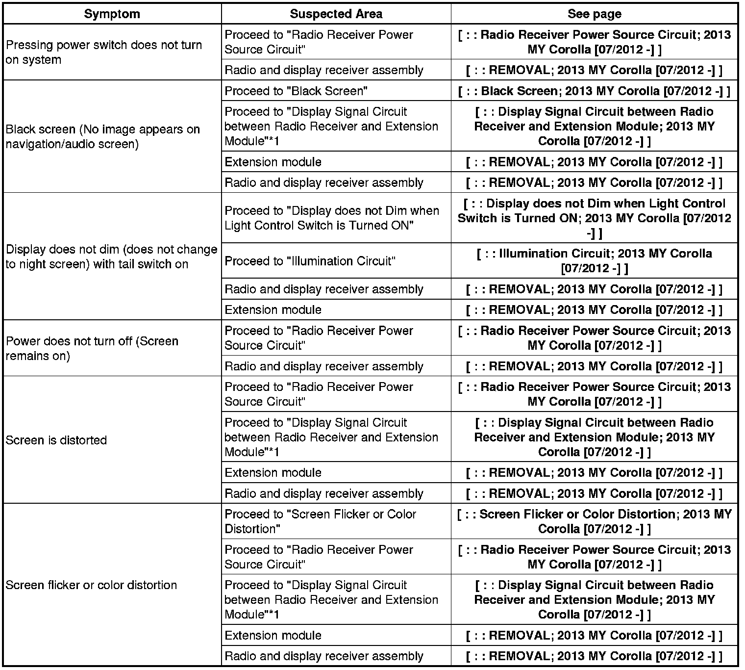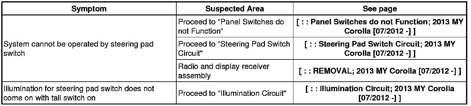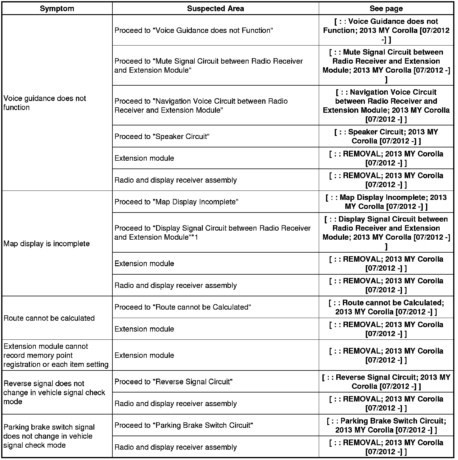NAVIGATION / MULTI INFO DISPLAY: NAVIGATION SYSTEM: PROBLEM SYMPTOMS TABLE; 2013 MY Corolla [07/2012 -]
