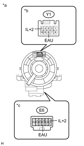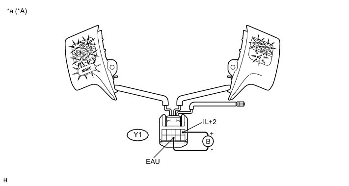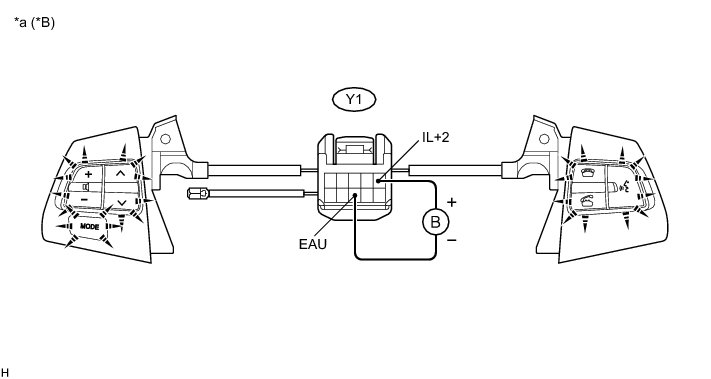(b) Connect a battery positive (+) lead to terminal IL+2 and a negative (-) lead to terminal EAU of the steering pad switch assembly*1 or steering pad switch LH*2 connector.