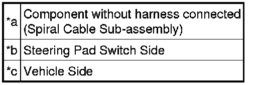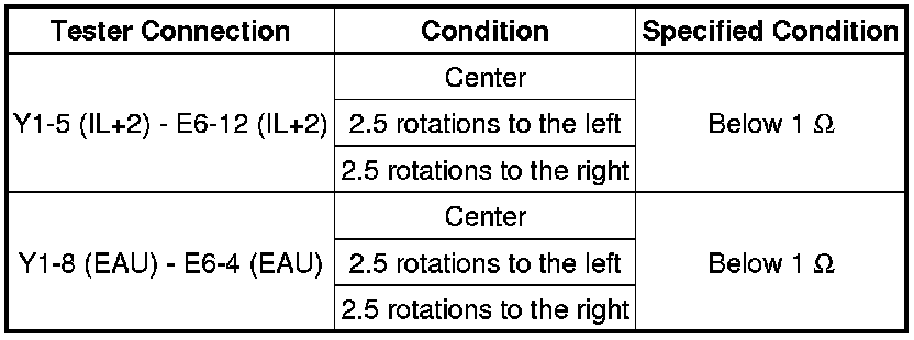 (d) After setting the spiral cable sub-assembly to the center position, rotate the spiral cable sub-assembly 2.5 times clockwise. Then while rotating the spiral cable sub-assembly 5 times counterclockwise, measure the resistance as shown in the table below.