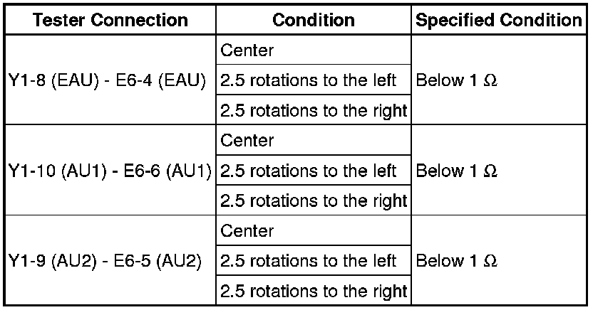 (d) After setting the spiral cable sub-assembly to the center position, rotate the spiral cable sub-assembly 2.5 times clockwise. Then while rotating the spiral cable sub-assembly 5 times counterclockwise, measure the resistance as shown in the table below.