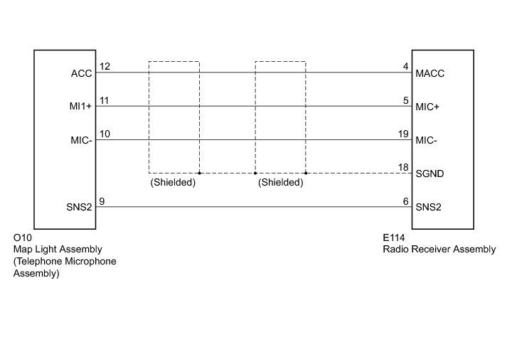 Using this circuit, the radio receiver assembly sends power to the map light assembly (telephone microphone assembly), and the map light assembly sends microphone voice signals to the radio receiver assembly (w/ sliding roof system).