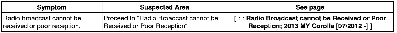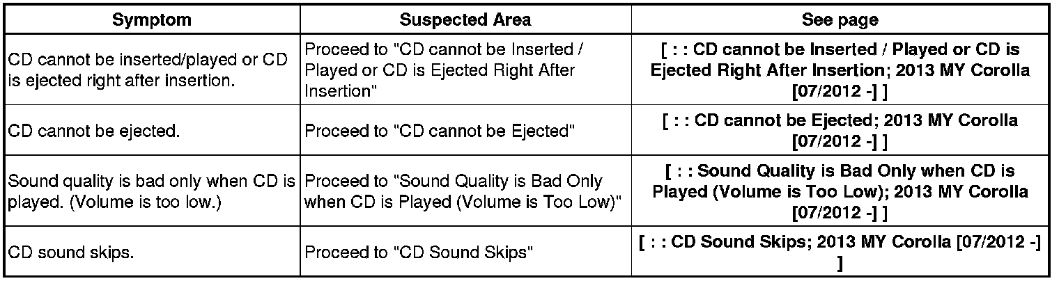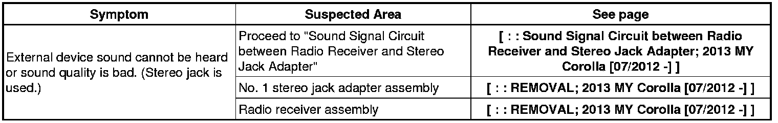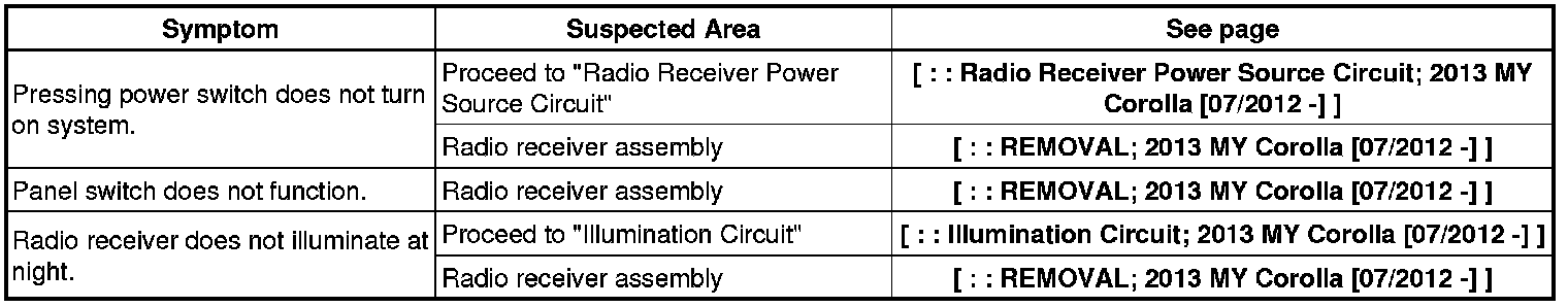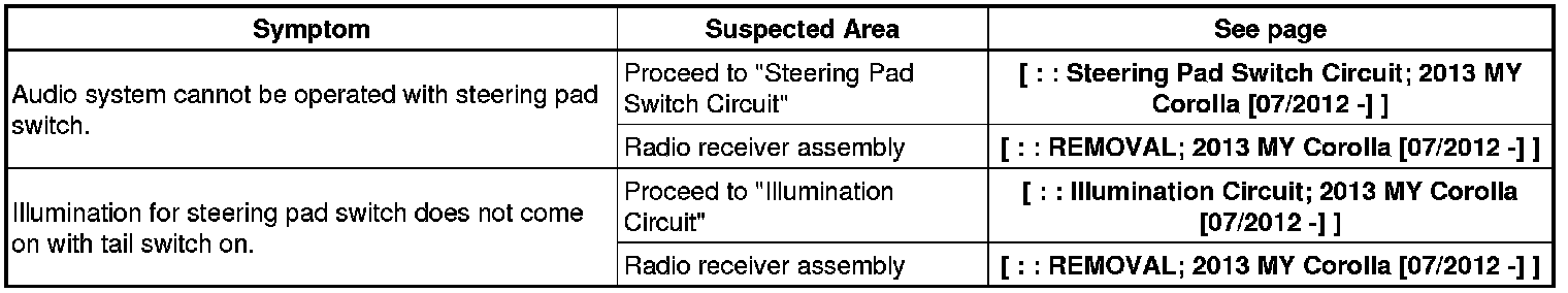 AUDIO / VIDEO: AUDIO AND VISUAL SYSTEM (w/o Multi-display): PROBLEM SYMPTOMS TABLE; 2013 MY Corolla [07/2012 -]