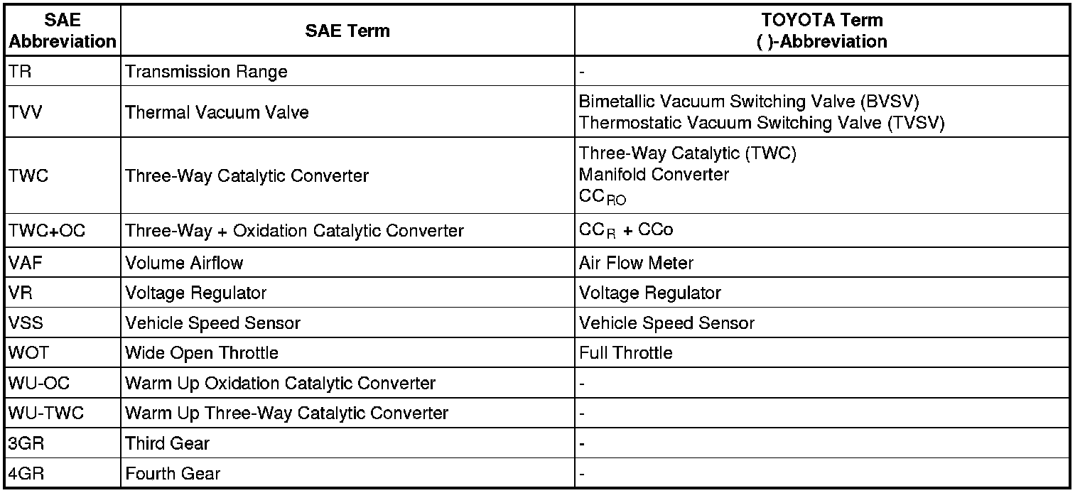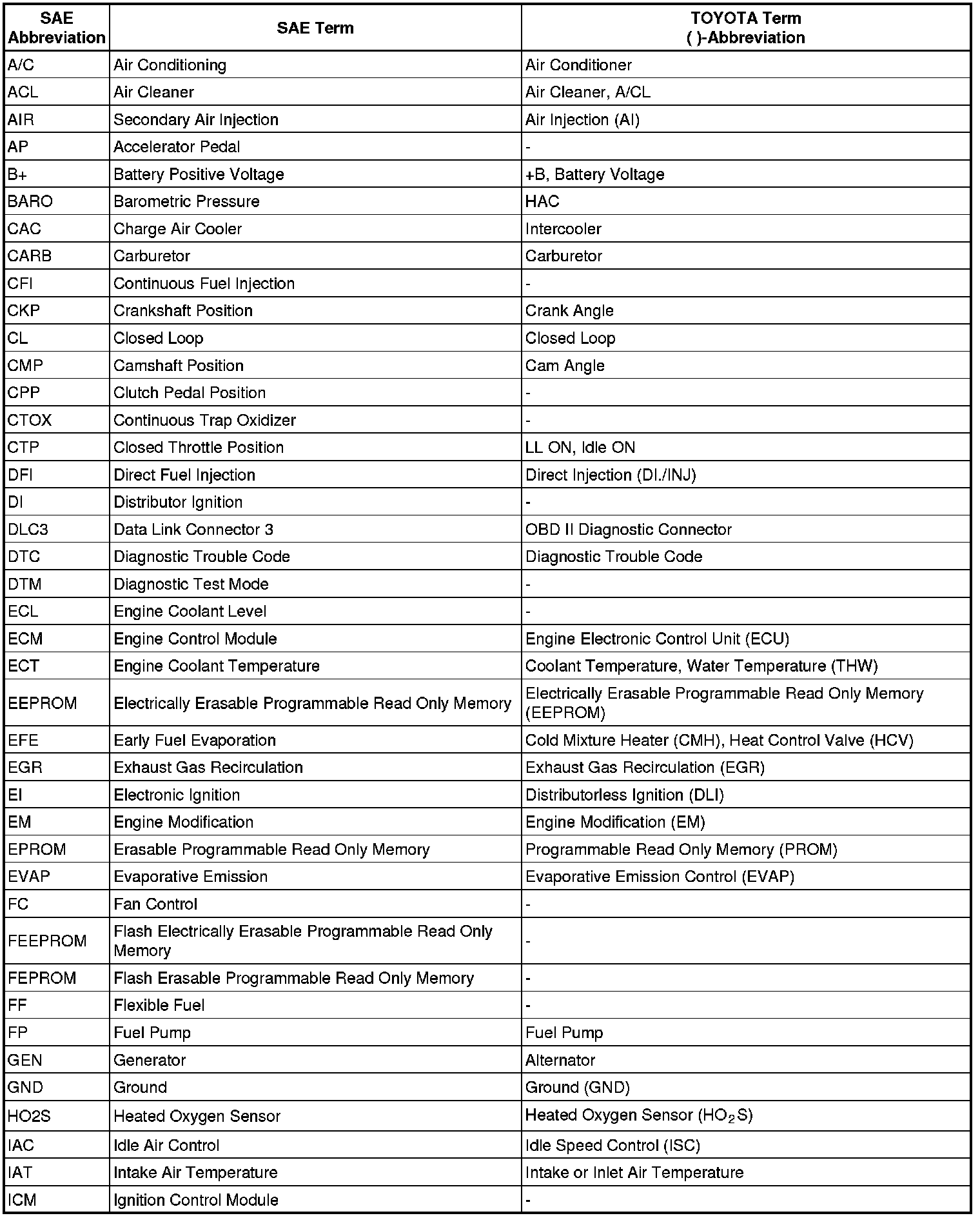 This glossary lists all SAE-J1930 terms and abbreviations used in this information in compliance with SAE recommendations, as well as their TOYOTA equivalents.