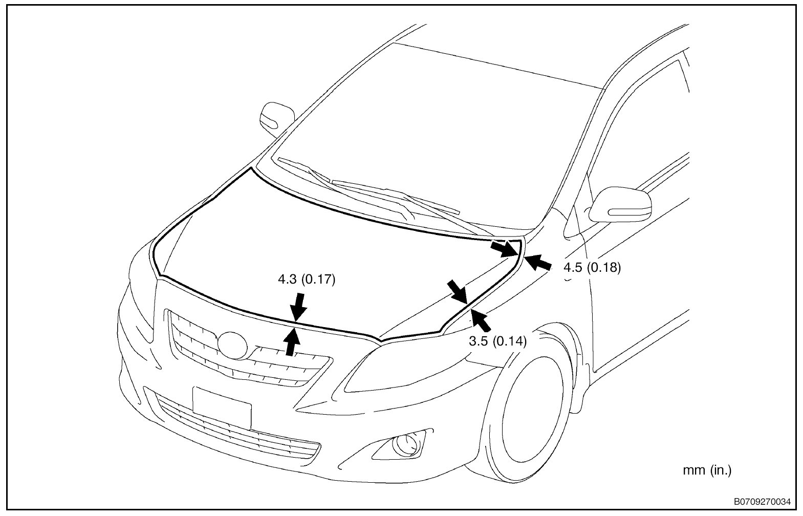 b. Adjust the clearance between the hood and front fender by moving the hood.