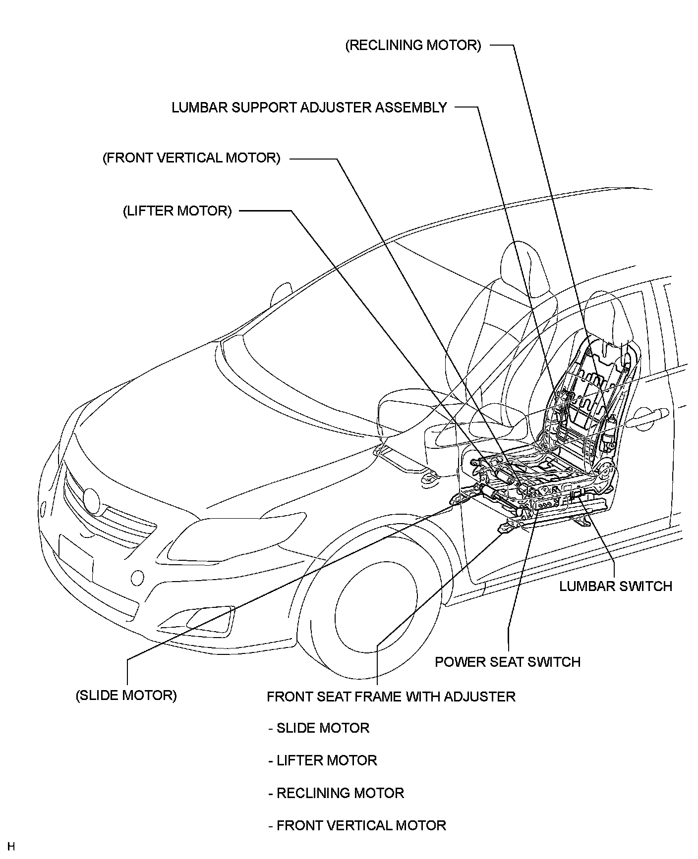 SEAT: FRONT POWER SEAT CONTROL SYSTEM: PARTS LOCATION; 2013 MY Corolla [07/2012 -]
