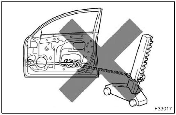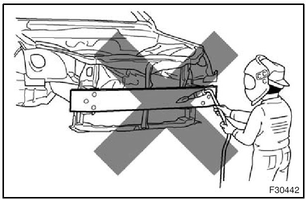 1. Rustproof high strength steel sheets are used for the body frame. Therefore, if these parts are heat repaired using an acetylene torch or equivalent, the crystalline structure changes, causing the strength of the steel sheets to decrease. Also, the zinc coating which is used to protect the body from rust will be damaged. This causes the surface of the steel sheets to become oxidized, which reduces their ability to resist rust.