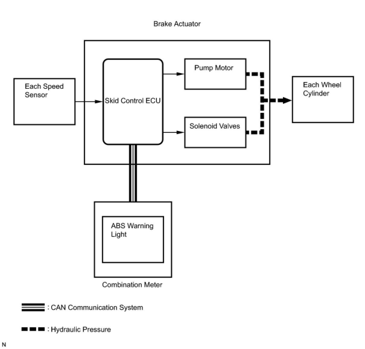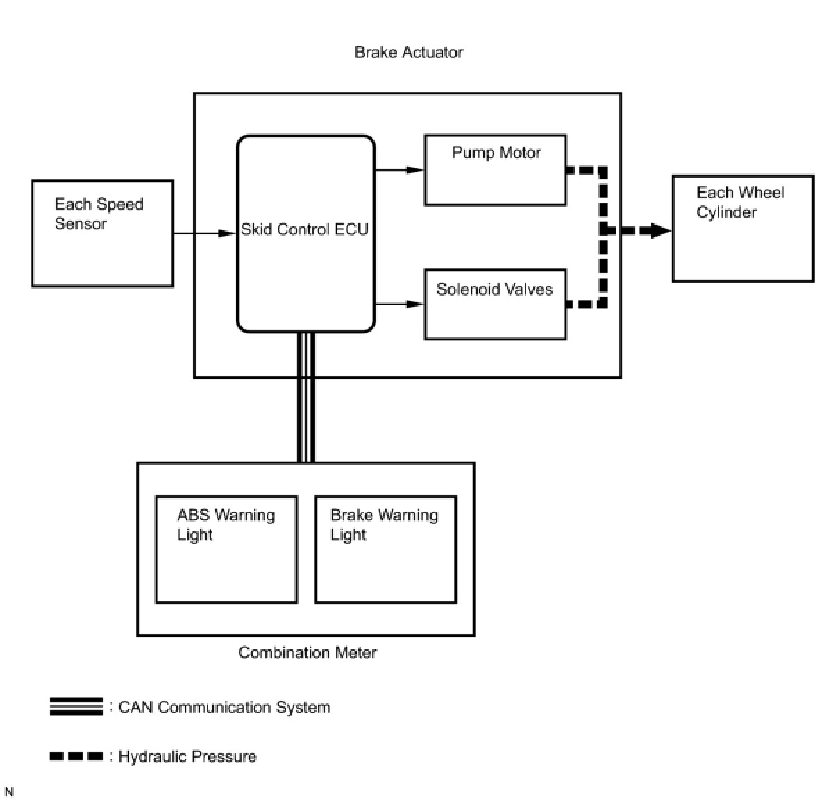 The skid control ECU receives a speed signal from each wheel speed sensor, and uses these signals to detect locking of the wheels. The ECU uses this information in order to determine appropriate control of the solenoid valves. The solenoid valves control the hydraulic pressure applied to the brake cylinder at each wheel. In this way, the solenoid valves are used to control the brake power split between the front and rear, and left and right wheels. The ABS warning and brake warning lights will come on if there is a malfunction in the EBD system.