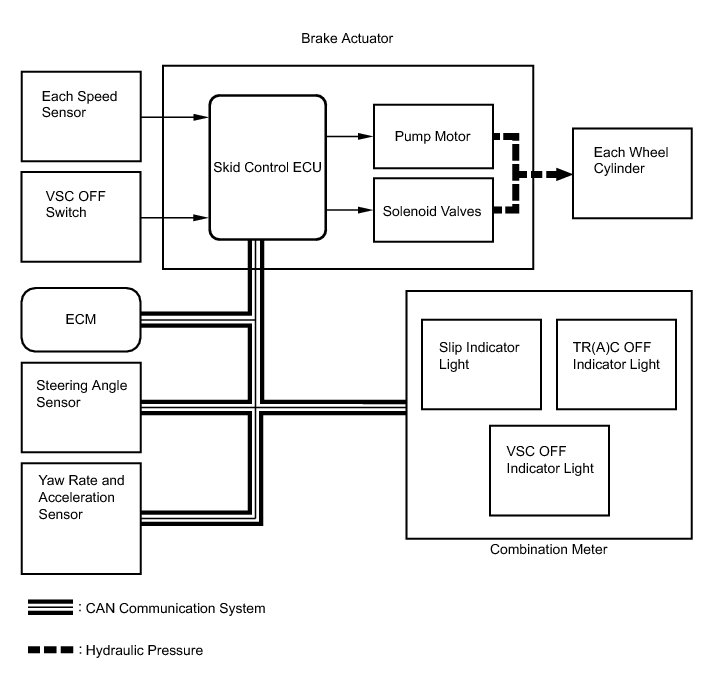 The skid control ECU determines the vehicle operating conditions based on signals received from the wheel speed sensors, yaw rate and acceleration sensor, and steering angle sensor. The skid control ECU sends signals via CAN communication to the ECM in order to control engine torque. The skid control ECU controls brake hydraulic pressure using the pump and solenoid valves.